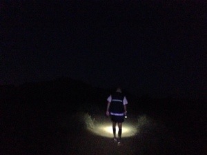i came into see Pauline at 76.5 miles at 17 hours and 17 minutes. I was emotionally spent and realized that 24 hours was likely out of my reach. This is when she put things in perspective, settled me down, and read me some comments from all of you. Lap 6 was pretty rough. I thought that I would be able to run a bit but I gave into the pain i was experiencing in my feet and undercarriage. It was a long and lonely 15.3 mile walk in the pitch black desert. At times, I turned off my headlamp as I walked just to soak it all in.